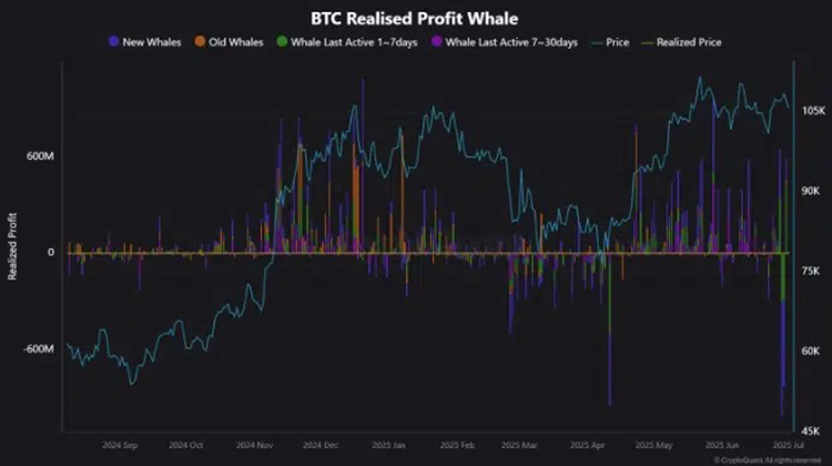 Según datos de CryptoQuant, las nuevas ballenas —inversionistas con más de 1.000 BTC— registraron más de 641 millones de dólares en beneficios realizados y 1.240 millones de dólares en pérdidas realizadas.